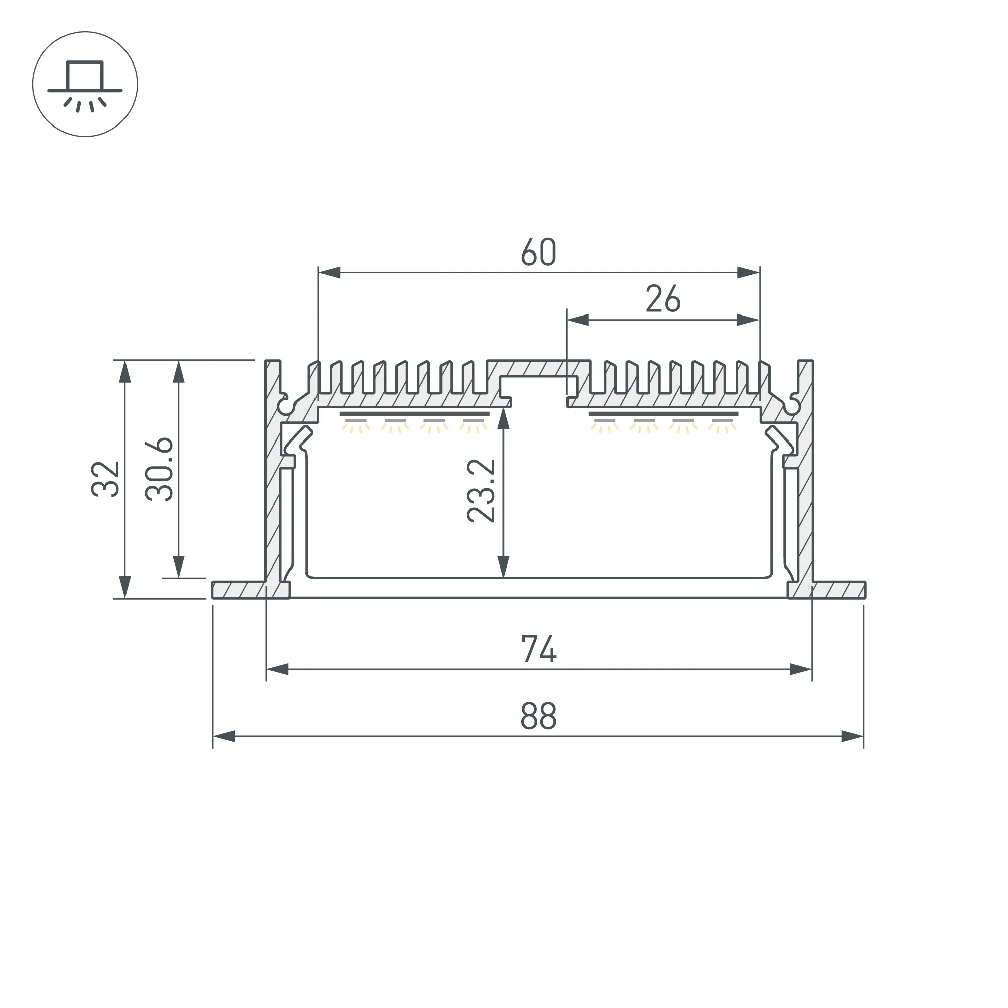 Комплект с экраном. Алюминиевый анодированный профиль для светодиодных лент и линеек. Габаритные размеры (L×W×H): 2500x88x32 мм, паз для установки 74 мм. Ширина площадки для ленты 60 мм. Аксессуары приобретаются отдельно.