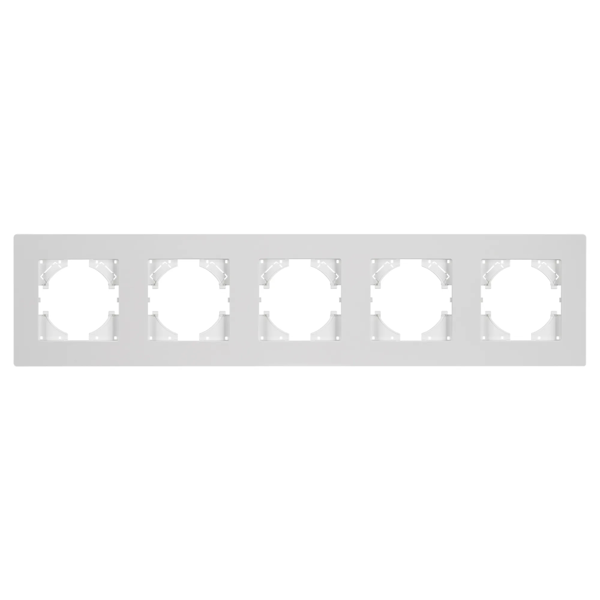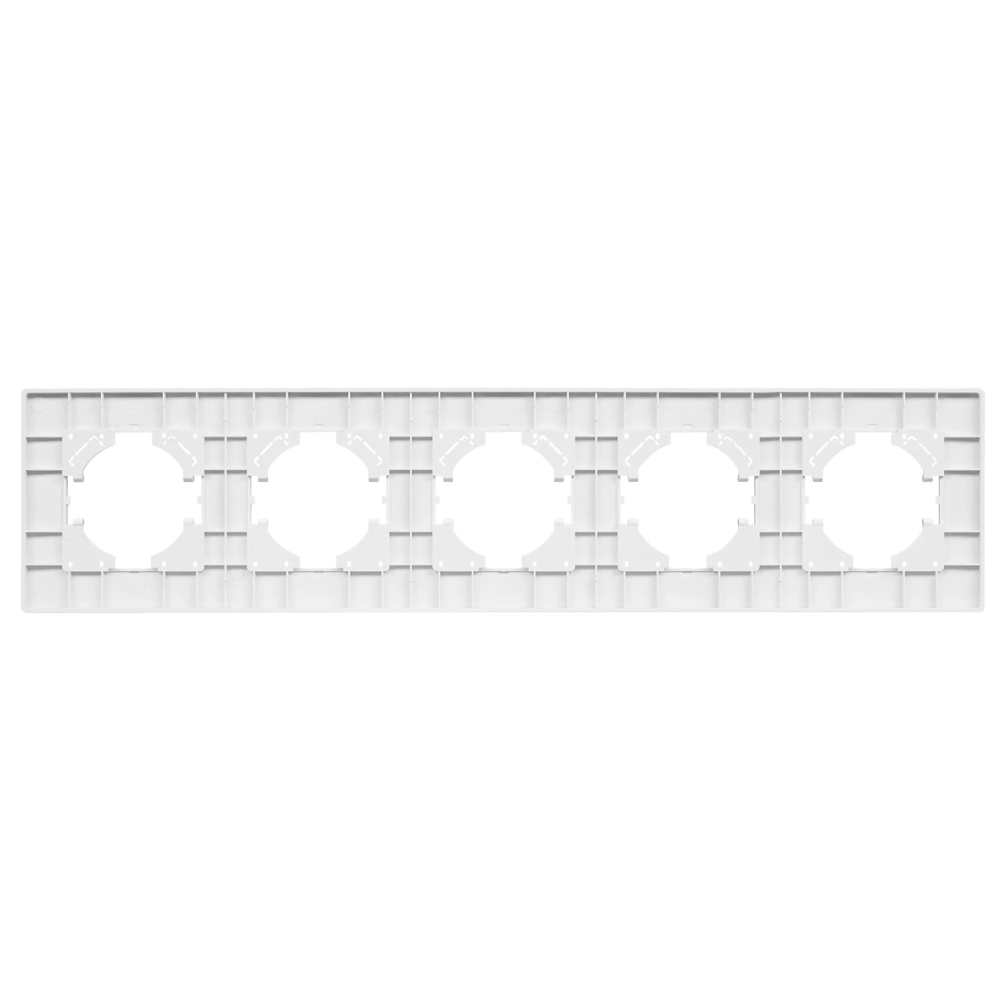 Рамка пластиковая на 5 постов, под встраиваемый механизм. Цвет - белый. Уровень герметичности IP20. Ориентация монтажа - горизонтальная (основным ориентиром служат посадочные выступы для накладки механизма).